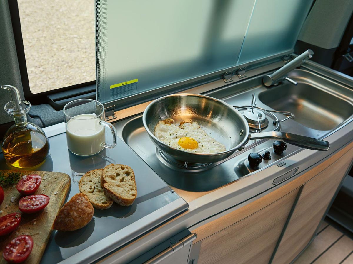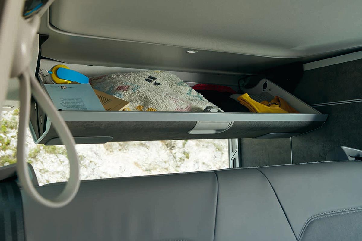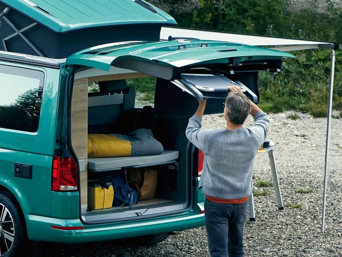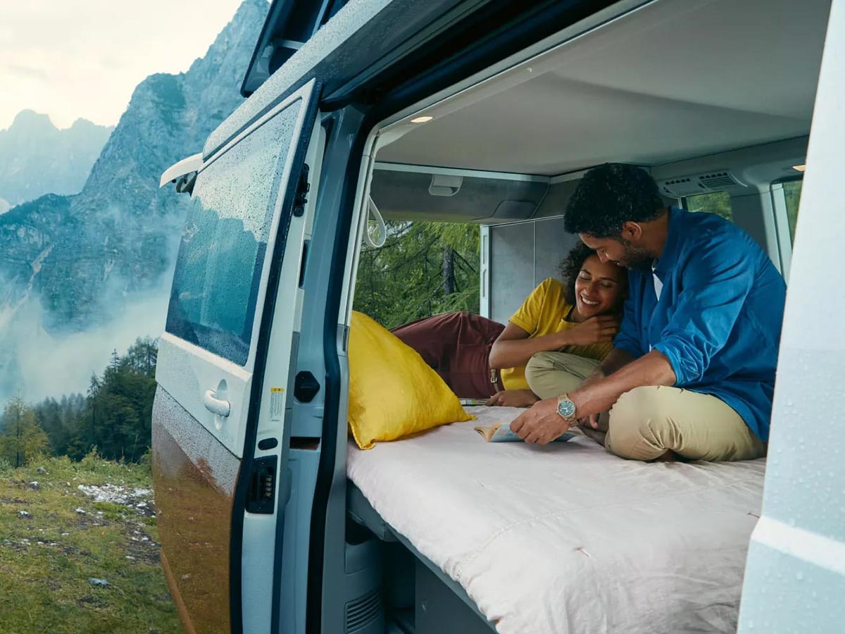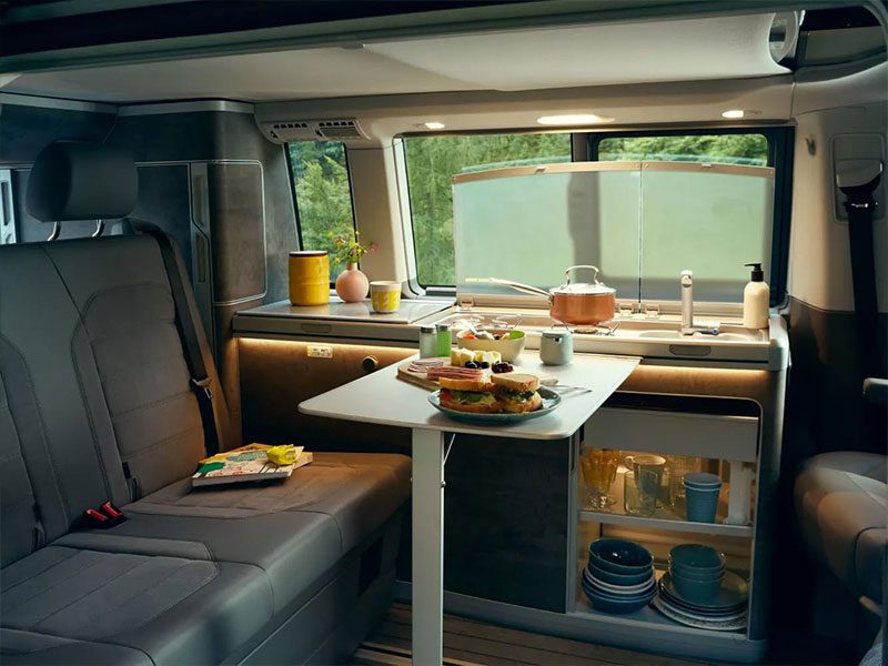 Find complete comfort in the fact that the California 6.1 has an interior that includes a fully functional kitchen, a large freshwater tank and plenty of storage space – everything you need to enjoy a smooth and relaxing journey. The cabin offers excellent acoustic and thermal insulation with ergonomic seats finished in robust premium upholstery. A new darker canvas and softer bed with spring system provides improved sleeping comfort in the roof section. The California 6.1 includes a Digital Cockpit, interior lighting system with lighting in the pop-up roof, tailgate, and kitchen cupboards; as well as a bed extension with sleeping mat and more.