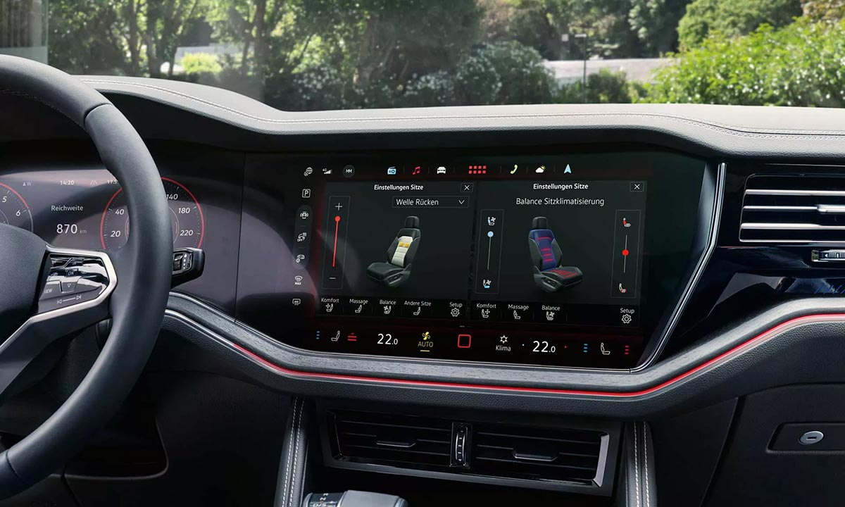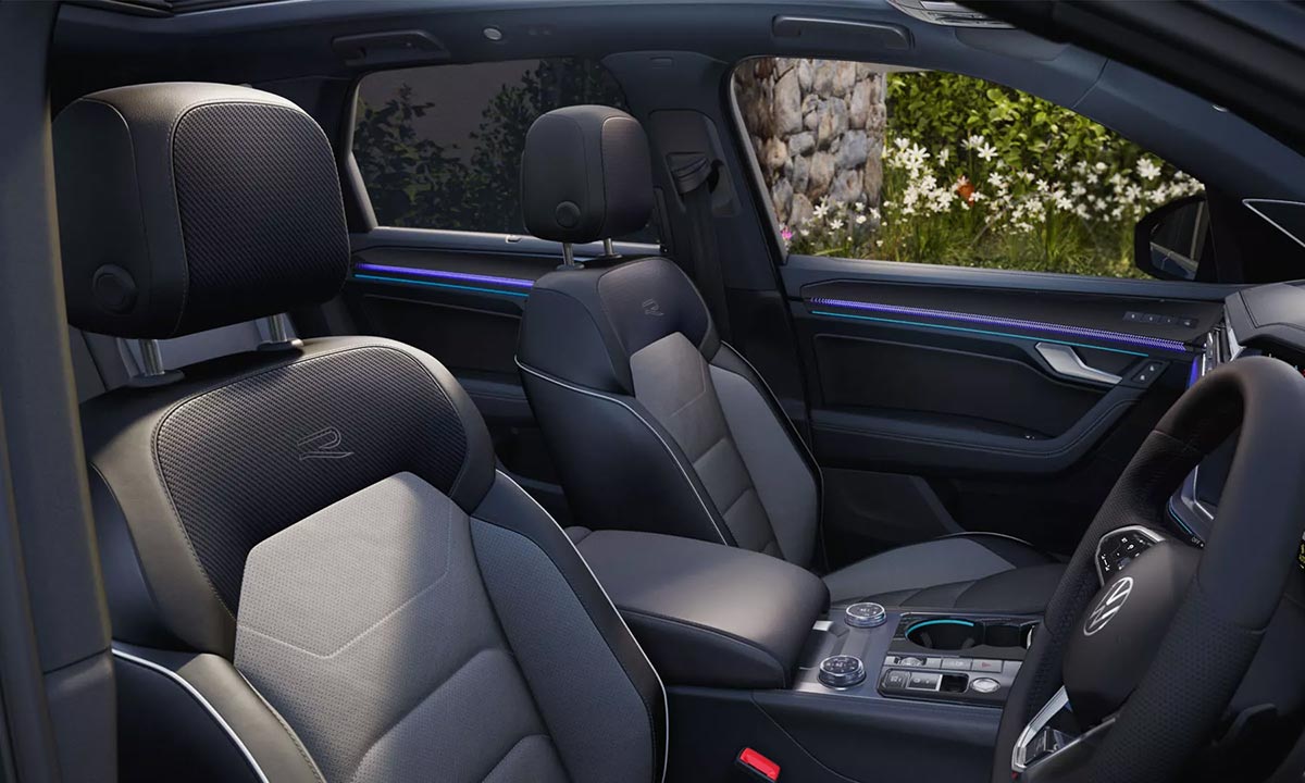 As soon as you sit inside the Touareg, it’s plain to see: the stylish interior design says it all. An elegant double seam runs from the dashboard across to the door sill. The Elegance and R-line are available with aluminium decorative trims and 30 color ambient lighting coupled with embossed Touareg name on the dash.