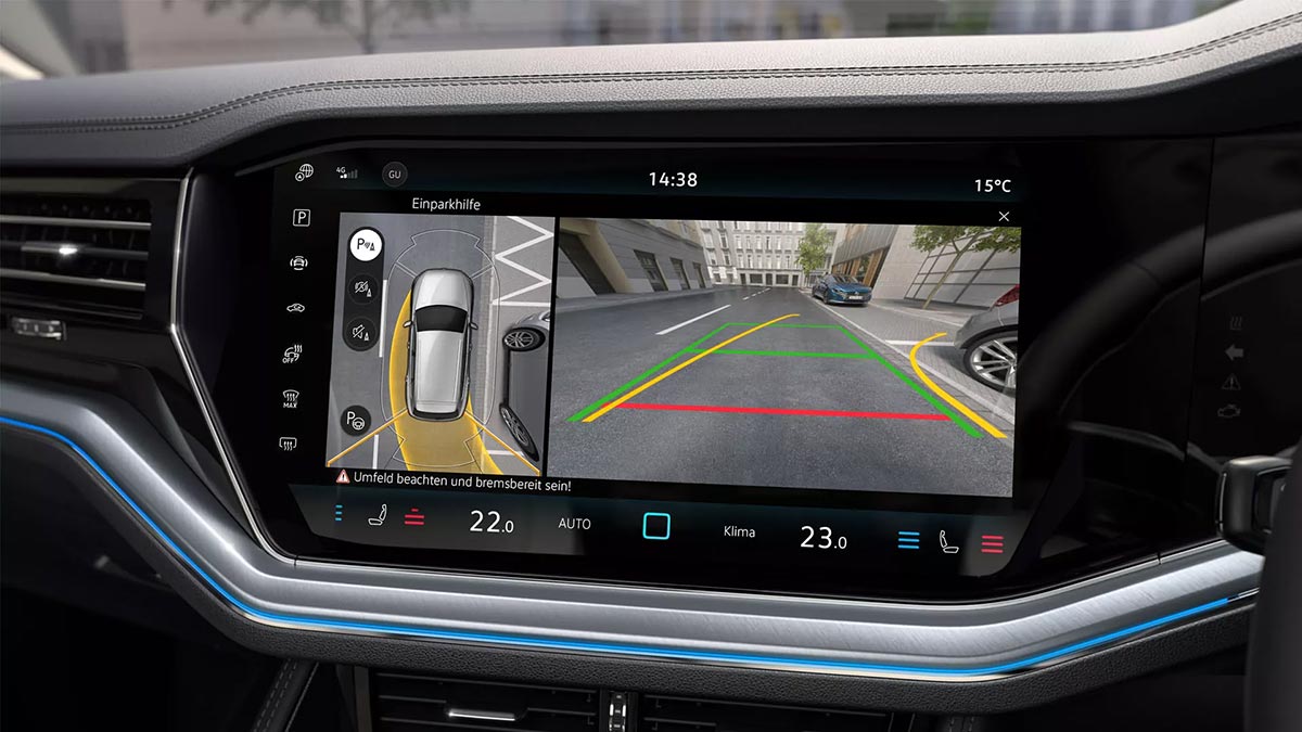 The new Touareg’s advanced driver assistance systems are designed to simplify your drive and enhance your safety, allowing you to focus on the joy of the journey. Adaptive Cruise Control maintains your desired speed and anticipates the road ahead, seamlessly adjusting to match speed limits and navigate curves. Front Assist, with pedestrian and cyclist monitoring, provides an extra layer of vigilance, alerting you to potential hazards and even braking automatically if needed.